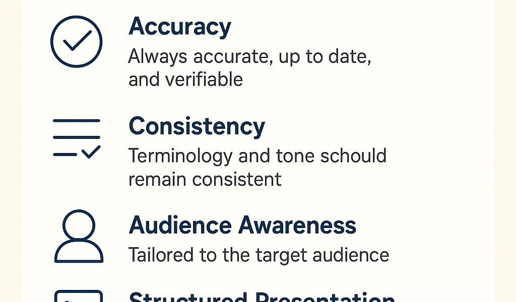 Good technical writing is not only about delivering information but also about making that information clear, reliable, and usable. Clarity, accuracy, consistency, audience awareness, structured formatting, and visual support are all essential qualities of effective technical writing.